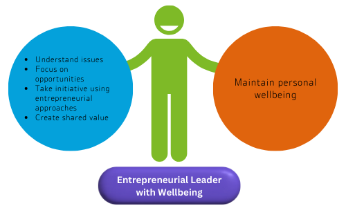 An Entrepreneurial Leader with Wellbeing is someone who applies entrepreneurial thinking and methods to problem-solving while also prioritizing their own personal wellbeing. They possess the ability to recognize and capitalize on both challenges and opportunities, effectively harnessing their creative potential to address common issues and generate value and positive outcomes for all stakeholders involved. Importantly, they maintain a healthy balance between their professional endeavors and personal wellbeing.